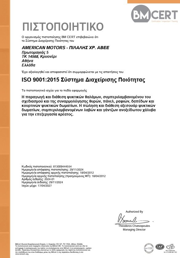 Η Βιομηχανία AMP είναι πιστοποιημένη με ISO 9001: 2015 και τα προϊόντα που διαθέτει είναι πιστοποιημένα με CE σύμφωνα με την ευρωπαϊκή οδηγία 89/106/ΕΚ από εξειδικευμένο ινστιτούτο ελέγχου και δοκιμών.