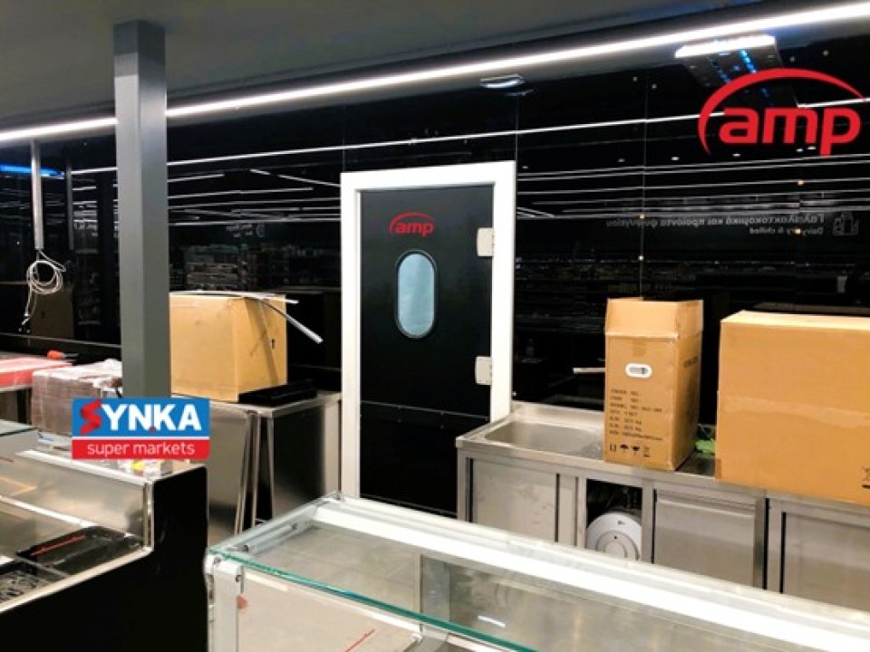Flip flap sanitary doors amp German polyethylene, double-action, for storage areas and supermarkets. They are manufactured in a industrial unit of AMP in the Kryoneri Industrial Area of Attica