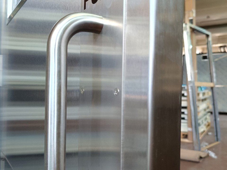 Stainless handle with U shape with or without lock or stainless push plate/pull handle. Stainless steel hinges. Aluminium door closer. State-of-the-art design and construction. Free from defects or malfunctions. Smooth and easy, noise free closing.